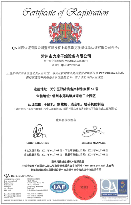 恭祝常州市力度干燥設備有限公司喜獲QA認證!
