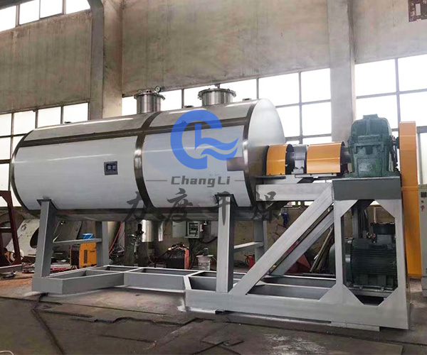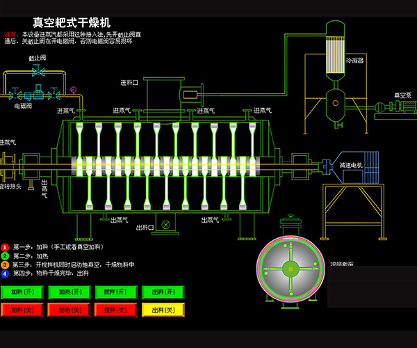 環氧樹脂從殼體上方投料口加入,在不斷轉動的耙齒的攪拌下,物料與殼體壁接觸時,表面不斷更新,被干燥物料受到蒸汽(或熱水、導熱油)間壁加熱,而使物料內濕份汽化,汽化的濕份由真空泵及時抽走。